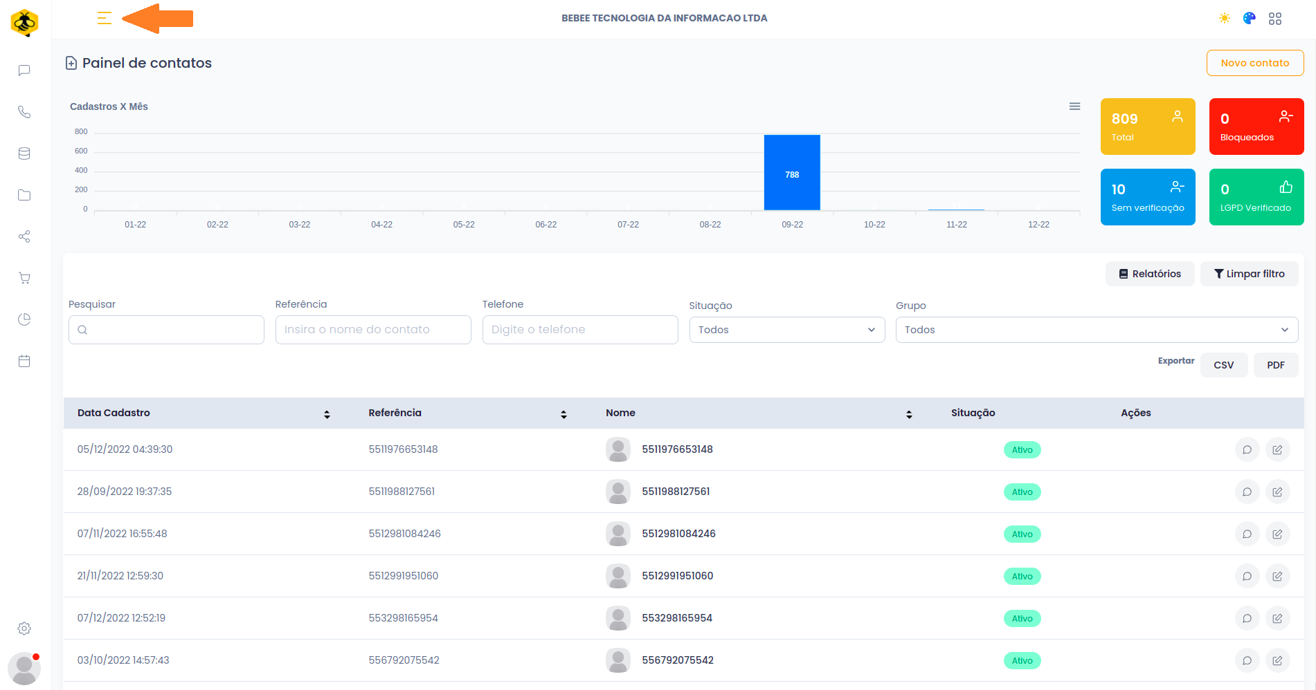 **Atenção:** antes de importar seus contatos, verifique se os números estão salvos de acordo com as diretrizes de nossa plataforma. Os contatos salvos devem conter **DDI** (Discagem Direta Internacional) e **DDD** (Discagem Direta à Distância) ambos acompanhados pelo número de contato. De acordo com as normas da nossa plataforma, os contatos devem ser salvos **sem espaços entre os números**, **sem caracteres especiais e sem letras. Por exemplo: 5511997207070**.